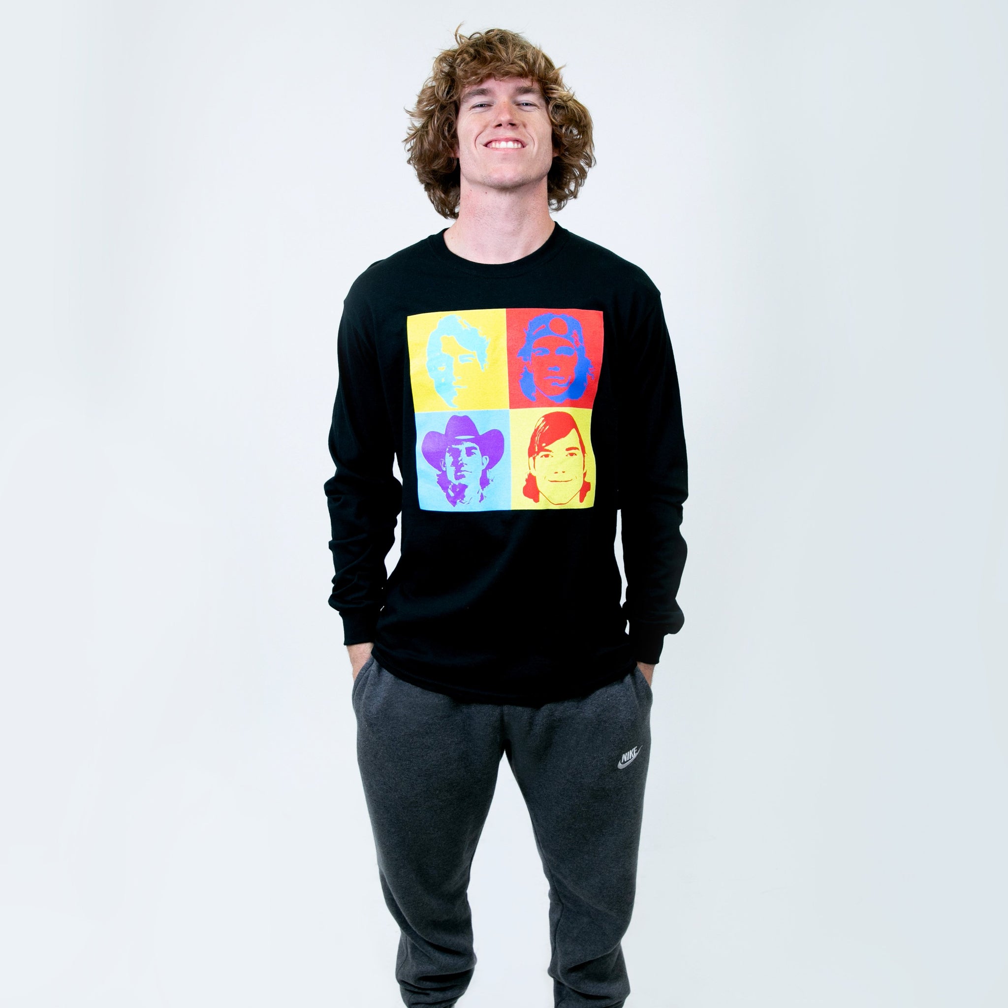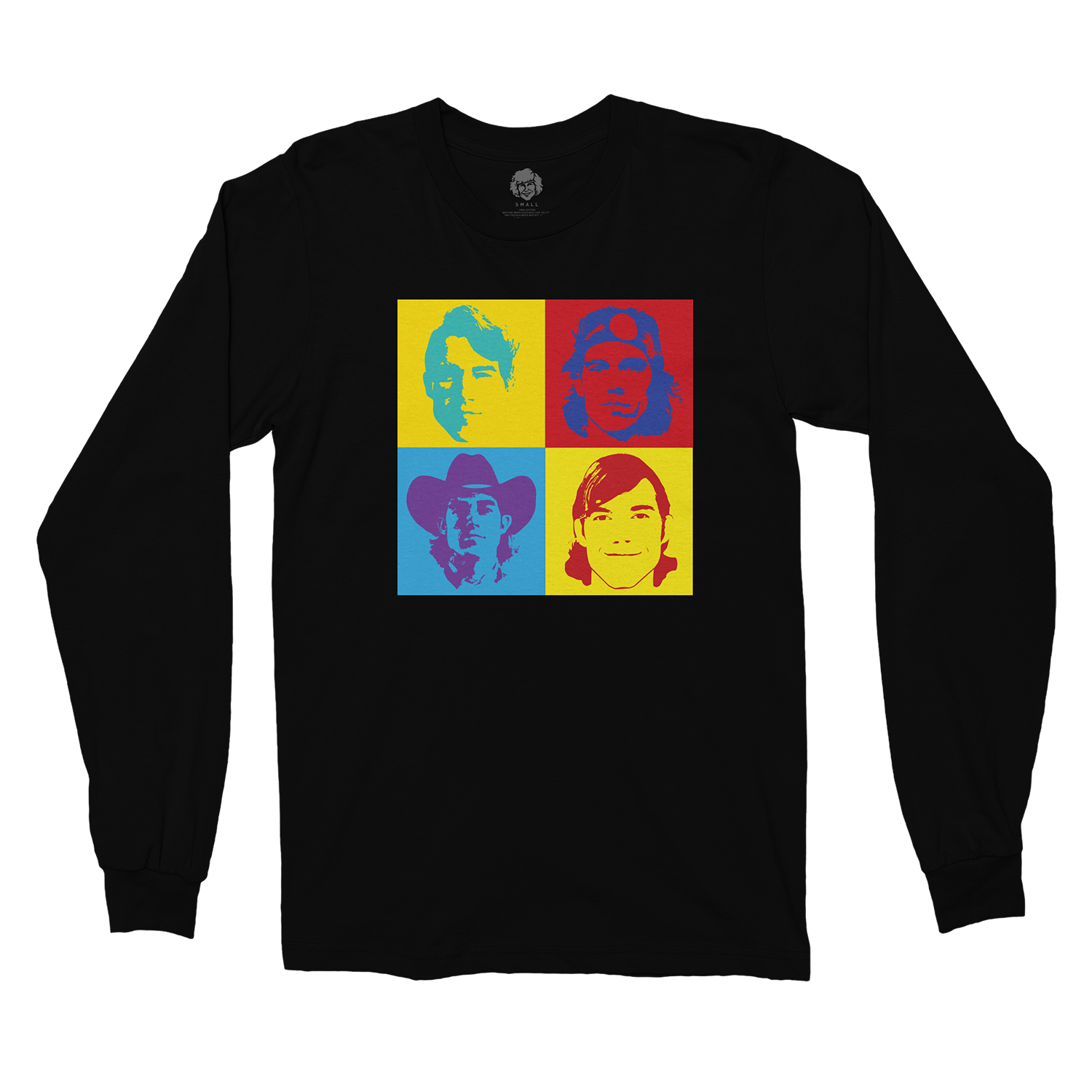 Black long sleeve shirt with multi-color ink print on the front