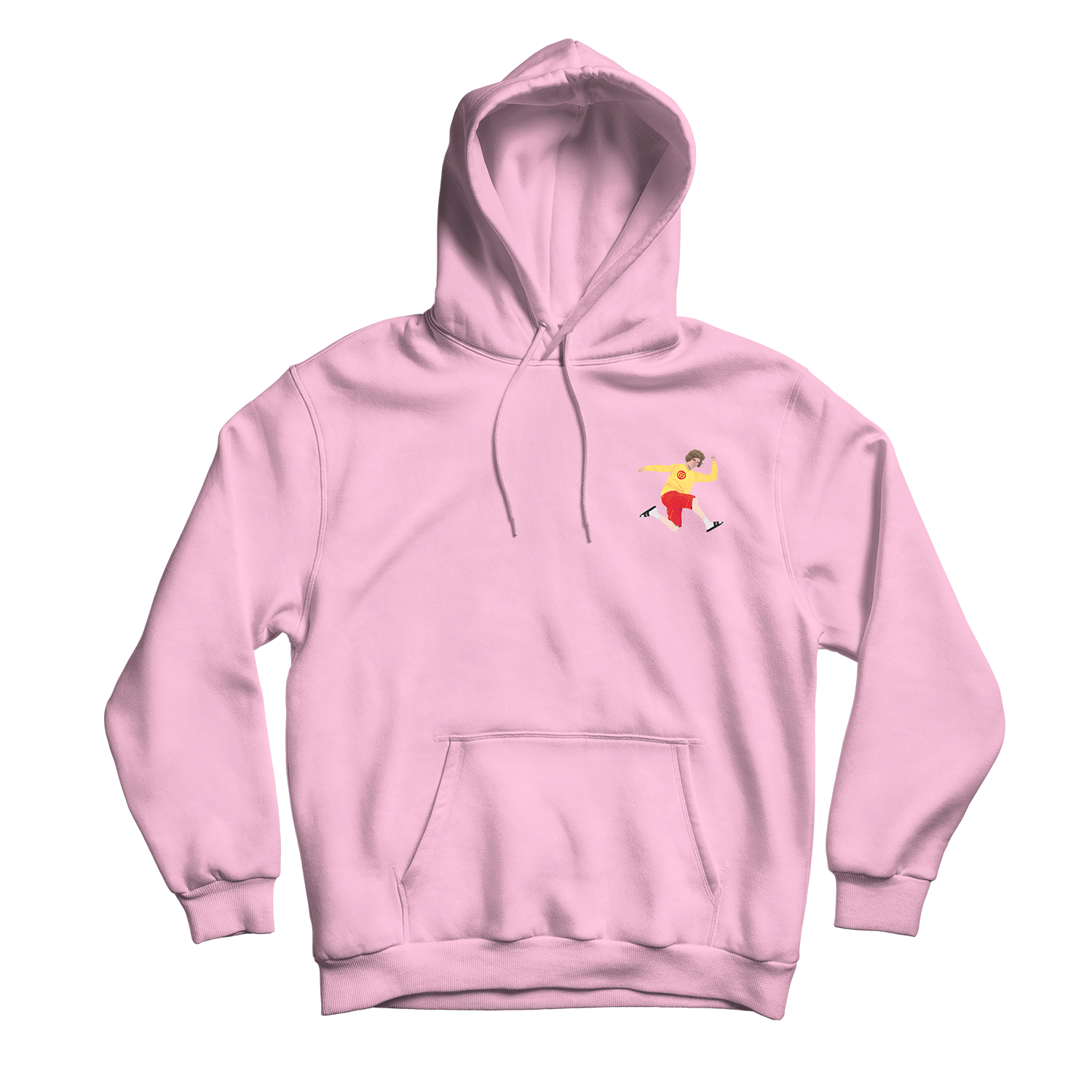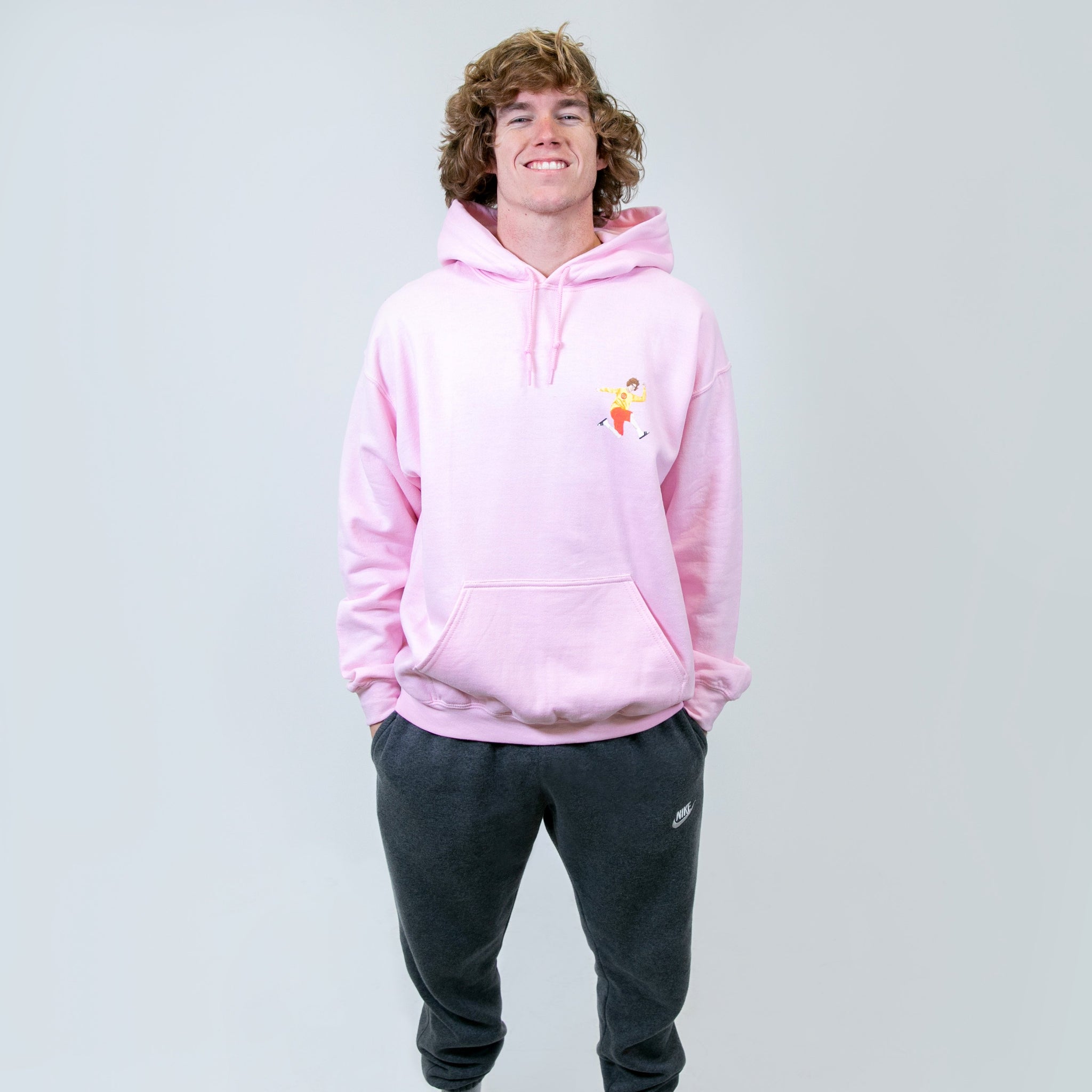 Light Pink pullover hoodie with multi-color ink print on the front