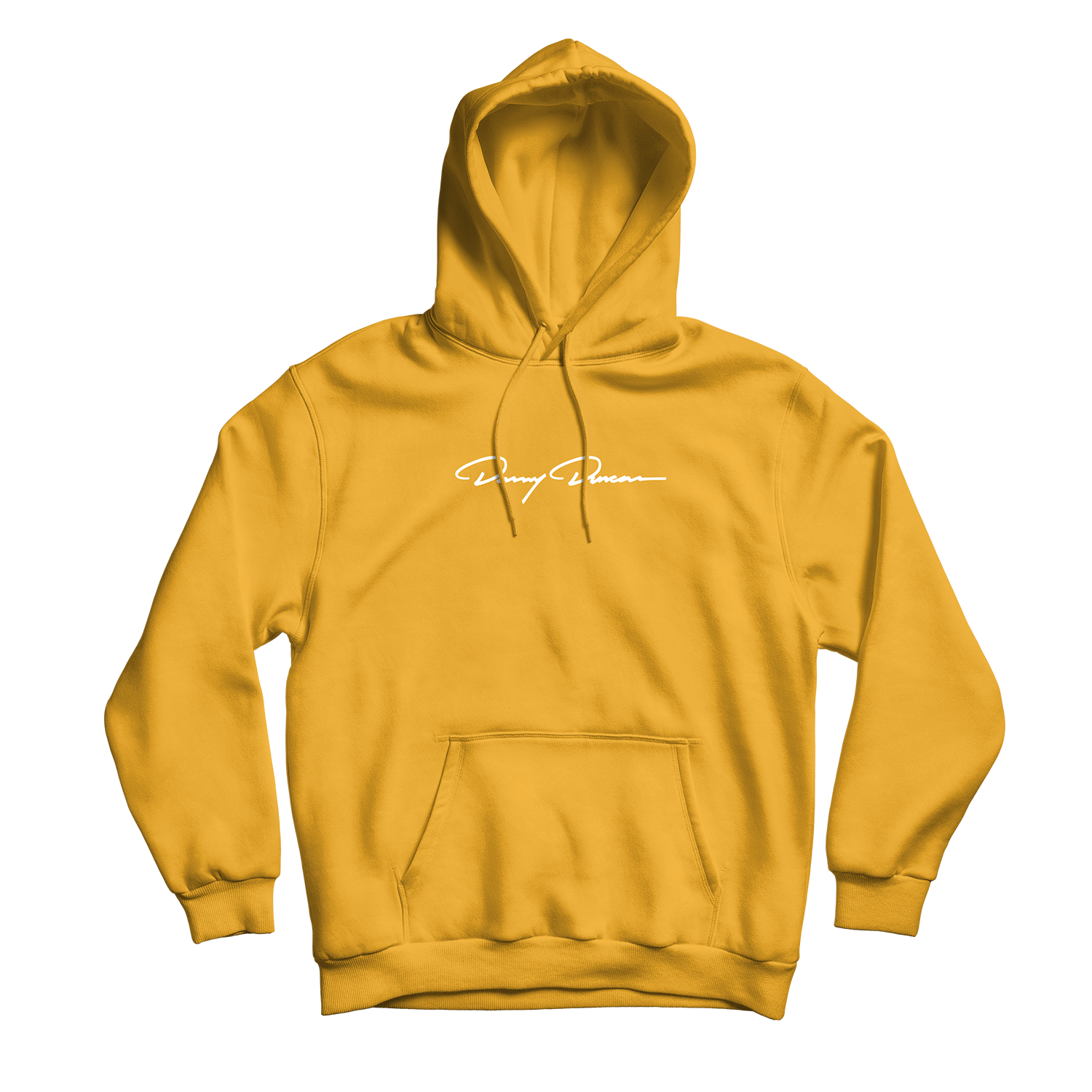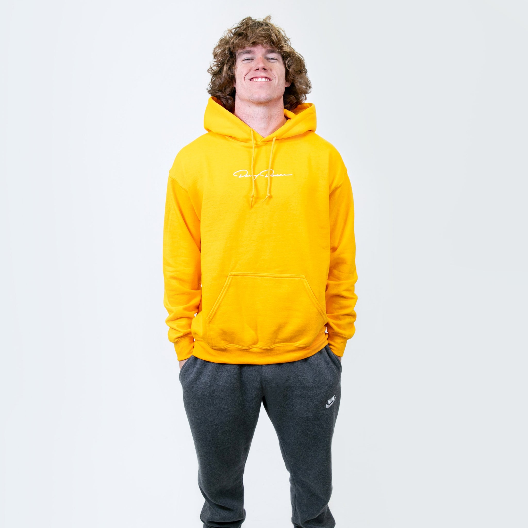 Gold pullover hoodie with white embroidery on the front